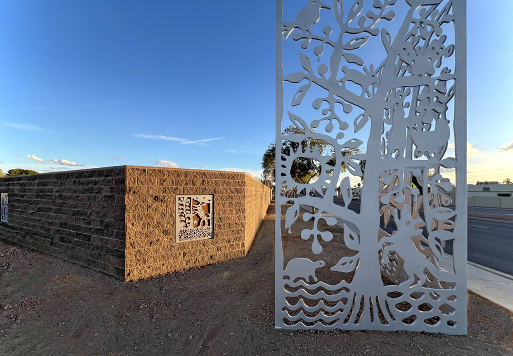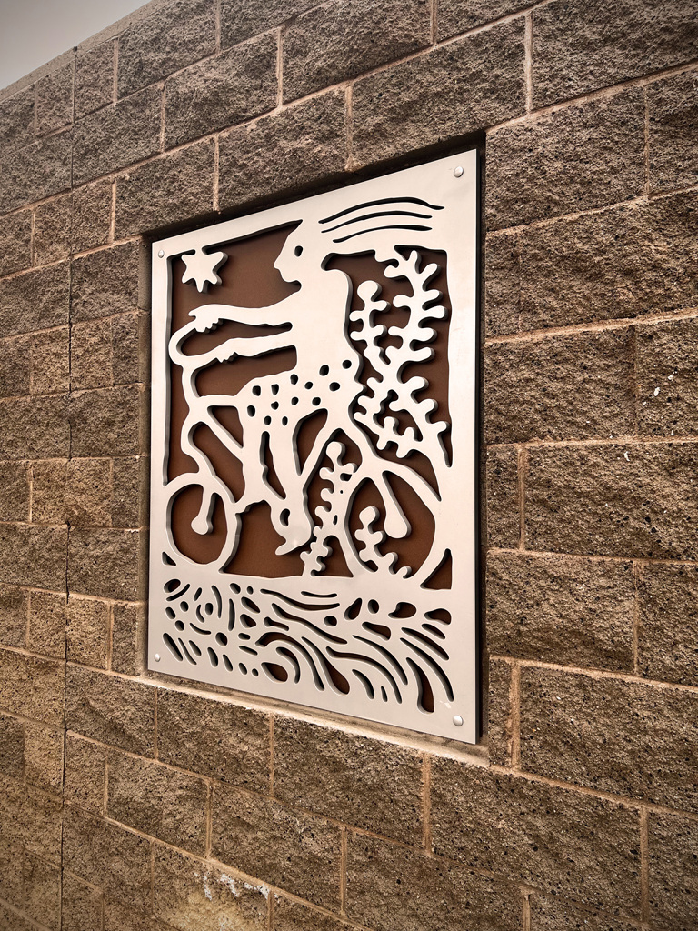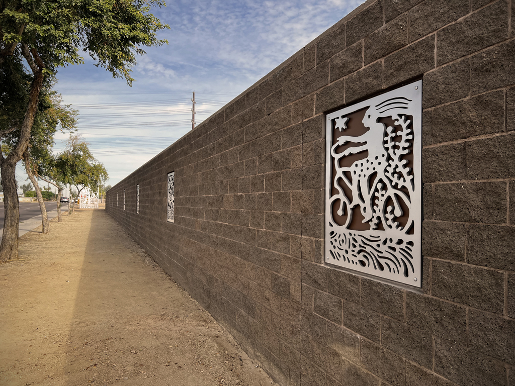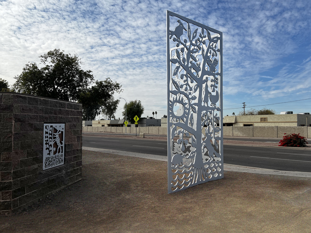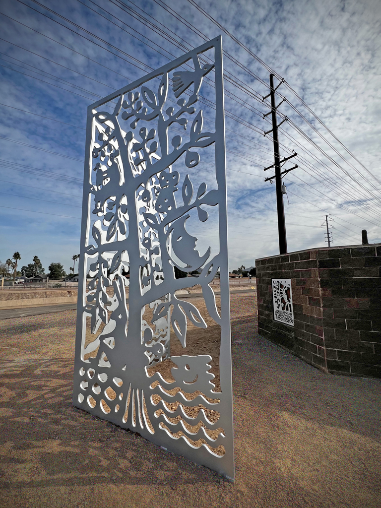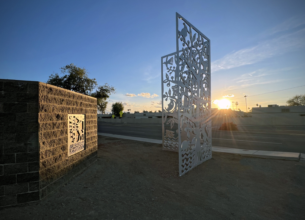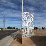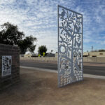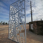 Look through this sun glyph to view the McDowell Mountains and read a brief description of their history. One of a series of view-finder frames, located on the bike path at the Scottsdale Waterfront. Each directs the viewer to a specific mountain view.