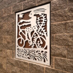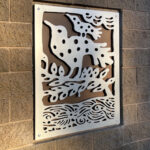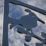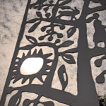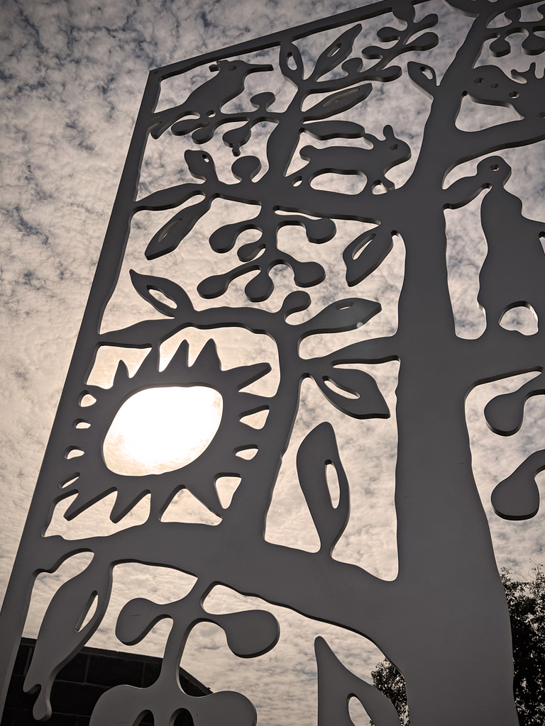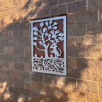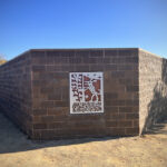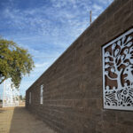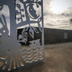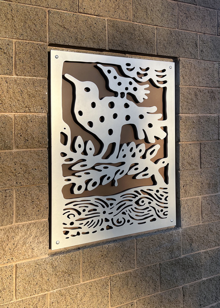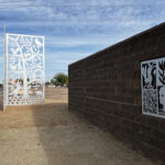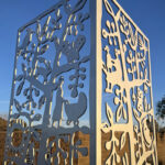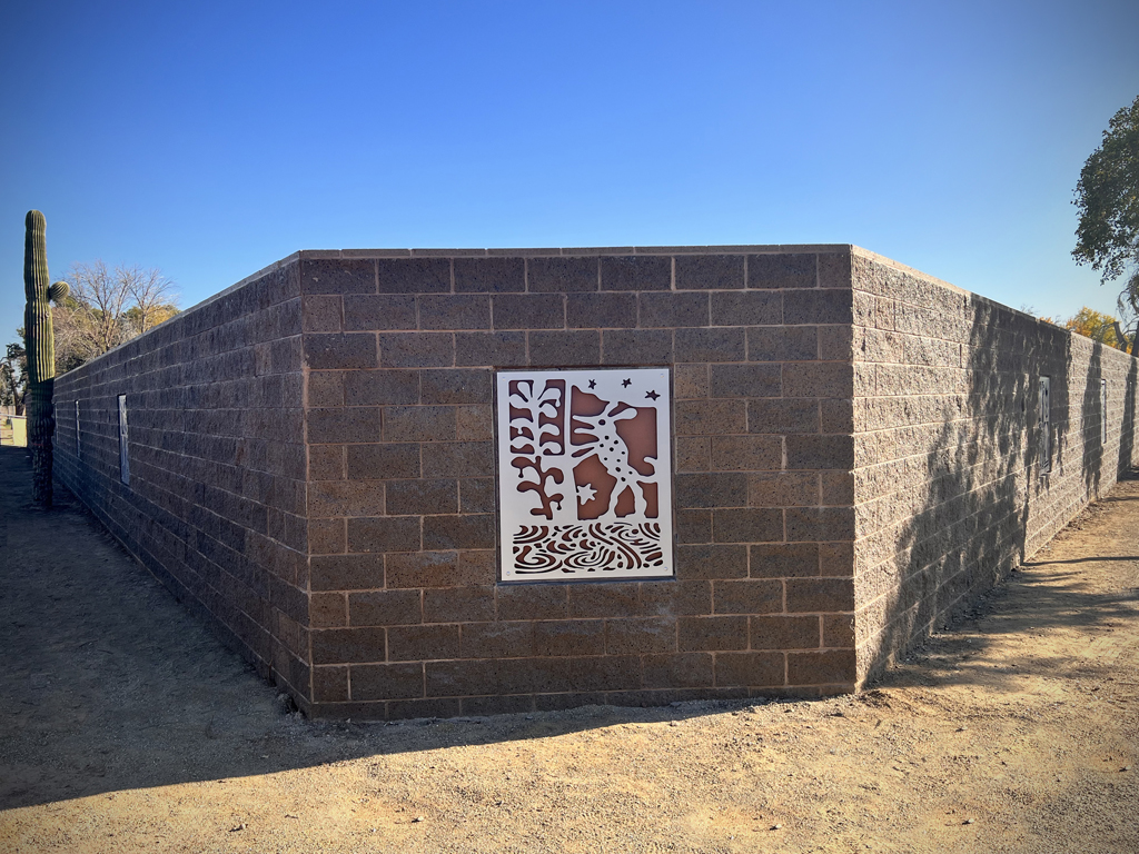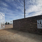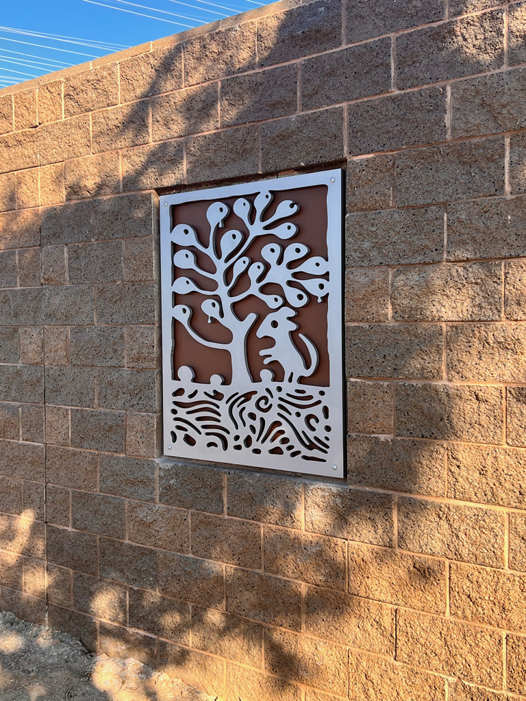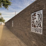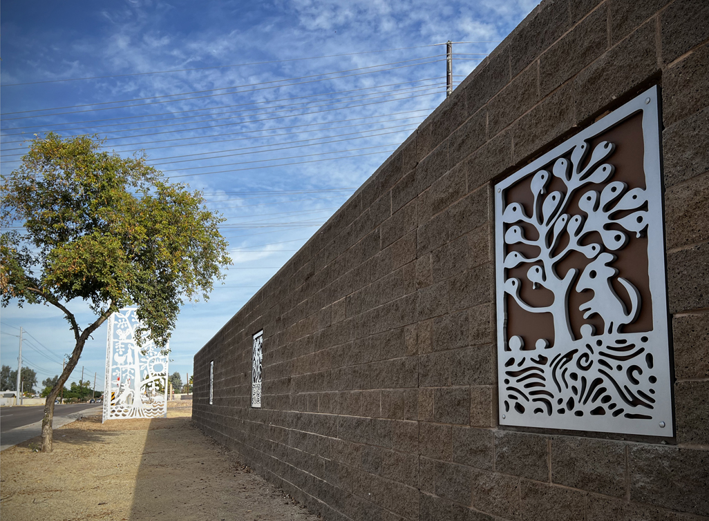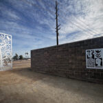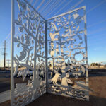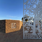 Look through this sun glyph to view the McDowell Mountains and read a brief description of their history. One of a series of view-finder frames, located on the bike path at the Scottsdale Waterfront. Each directs the viewer to a specific mountain view.
