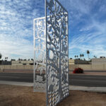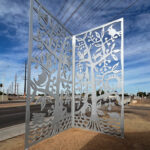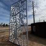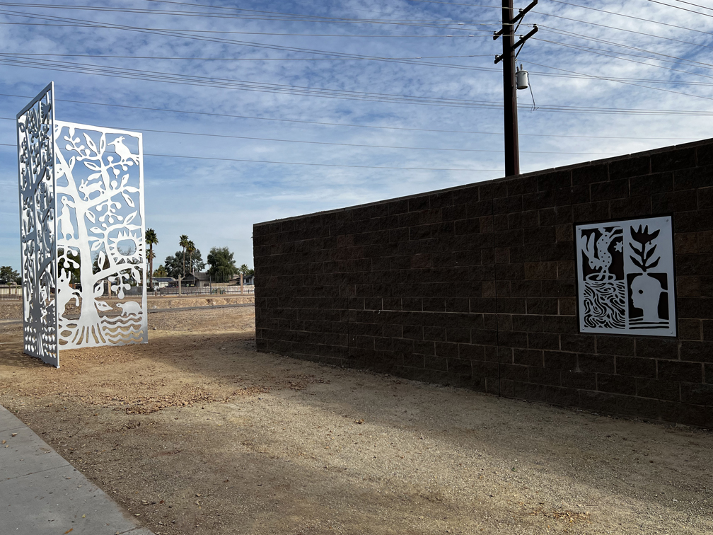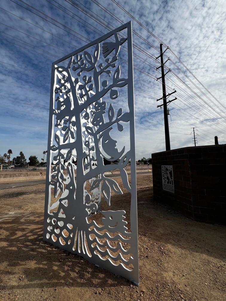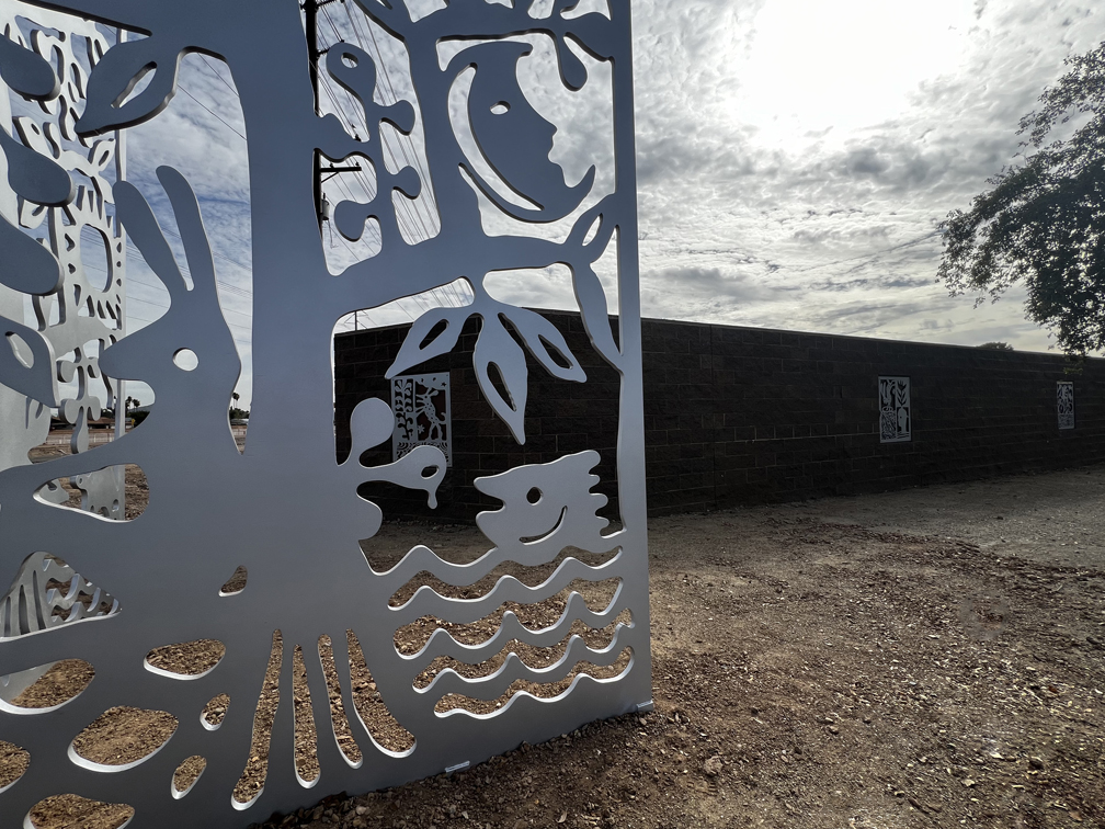 26 steel artworks create a drive-by gallery of images that reference the water, plants, wildlife and people of Cortez Park neighborhood. The contrasting steel panels attach to the concrete walls of the Cortez Well project.